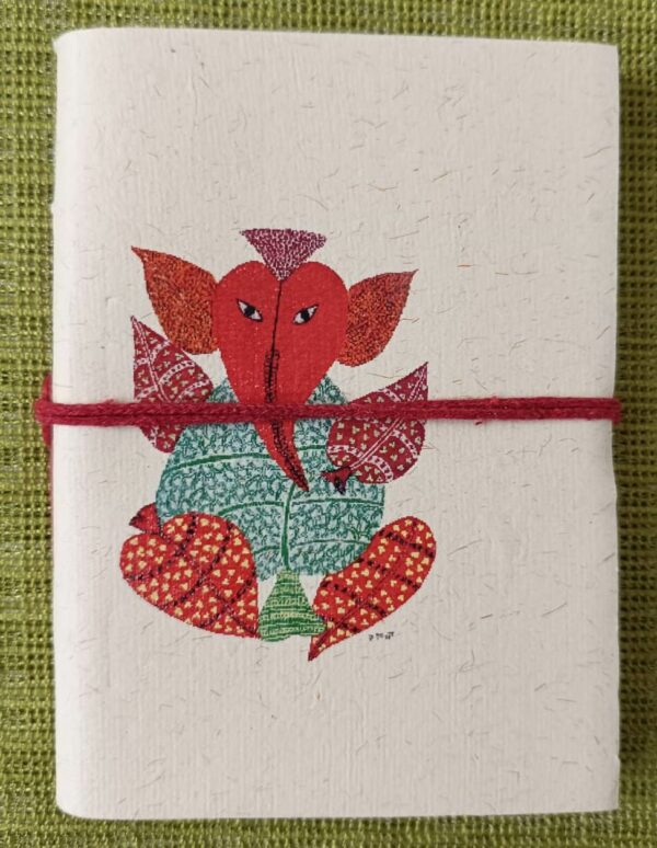A cute little Ganesha printed in red with different shapes of the betel leaves is an auspicious beginning to penning down your thoughts. Lord Ganesha represents intellect and intelligence and is the god of good beginings needed to achieve perfection in all that we do. Given the symbolism this handmade diary will give you positive thoughts .