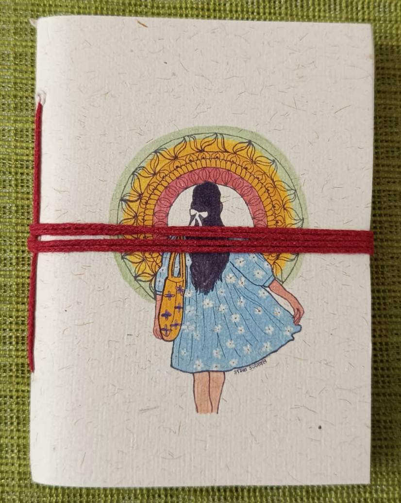 Embrace simplicity and sunshine with this beautifully illustrated handcrafted notebook. The cover features a serene artwork of a girl in a blue dress, surrounded by a radiant sunflower-inspired mandala — symbolizing warmth, growth, and positivity. Tied with a rustic red thread, this notebook carries a touch of elegance and mindfulness in every detail.