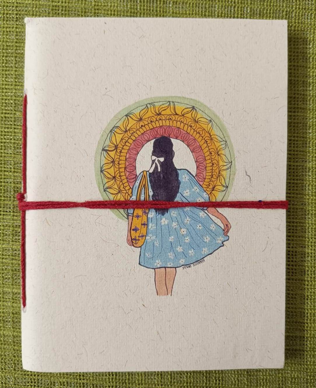 Embrace simplicity and sunshine with this beautifully illustrated handcrafted notebook. The cover features a serene artwork of a girl in a blue dress, surrounded by a radiant sunflower-inspired mandala — symbolizing warmth, growth, and positivity. Tied with a rustic red thread, this notebook carries a touch of elegance and mindfulness in every detail.