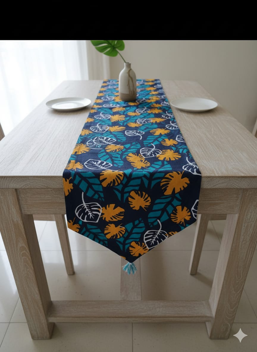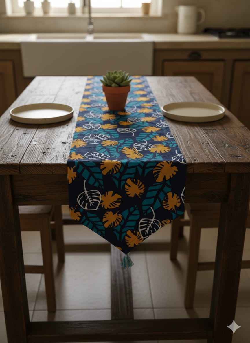Bring the vibrant spirit of nature into your home with our *Leaves Table Runner*. Featuring a bold and colorful pattern of golden yellow, teal, and white leaves against a deep navy backdrop, this runner adds a refreshing touch of botanical elegance to any dining or kitchen table. Crafted with care and designed to brighten up your space, it’s perfect for those who love to celebrate the beauty of the outdoors while keeping their décor stylish and contemporary. The charming tassel detail at the ends adds a playful finishing touch to this nature-inspired piece.