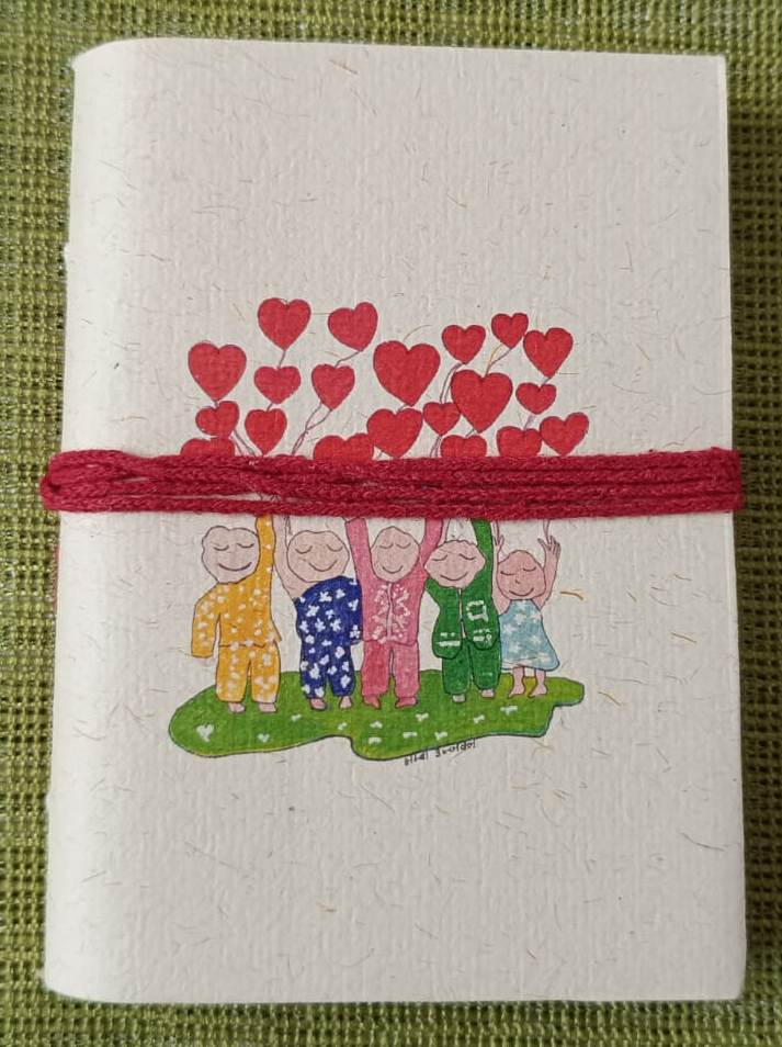 Celebrate happiness, love, and togetherness with this adorable handcrafted notebook. The cover illustration features cheerful little friends holding heart-shaped balloons — a beautiful reminder that joy grows when shared. Wrapped in a soft red thread, this notebook captures the innocence of childhood and the warmth of pure friendship.